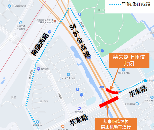 1、S4东侧莘朱路上匝道封闭。莘朱路跨线桥禁止机动车通行:莘朱路跨S4跨线桥禁止机动车双向通行,途经此地的社会车辆可沿虹莘路-梅陇西路-莘朱路绕行。