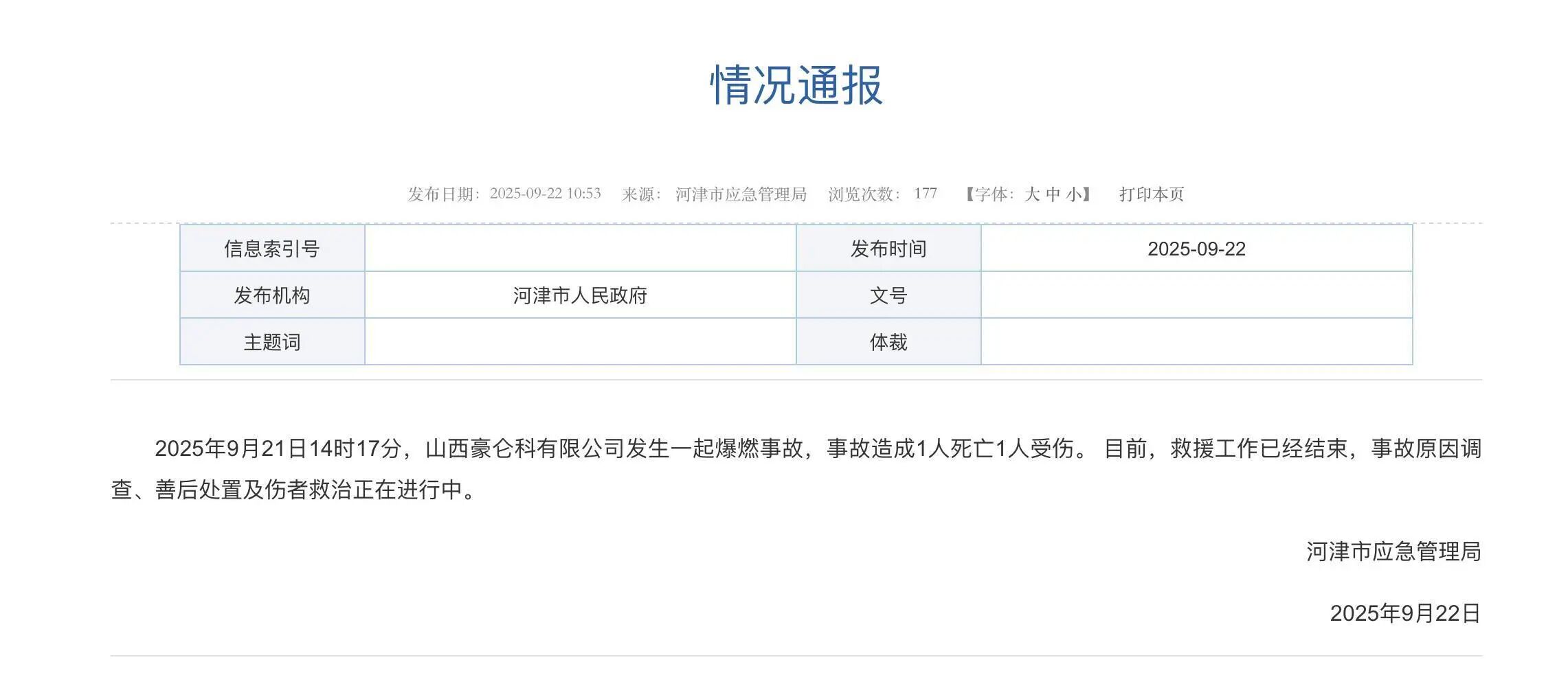 事件:山西省河津市应急管理局发布通报:2025年9月21日14时17分,山西豪仑科有限公司发生一起爆燃事故,事故造成1人死亡1人受伤。