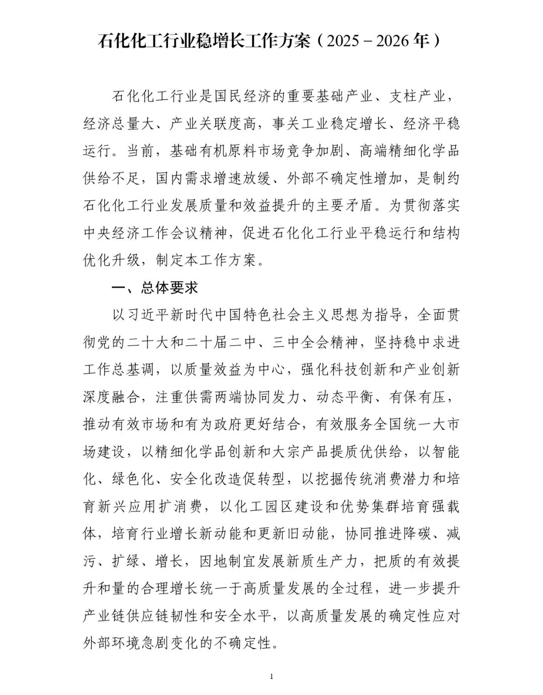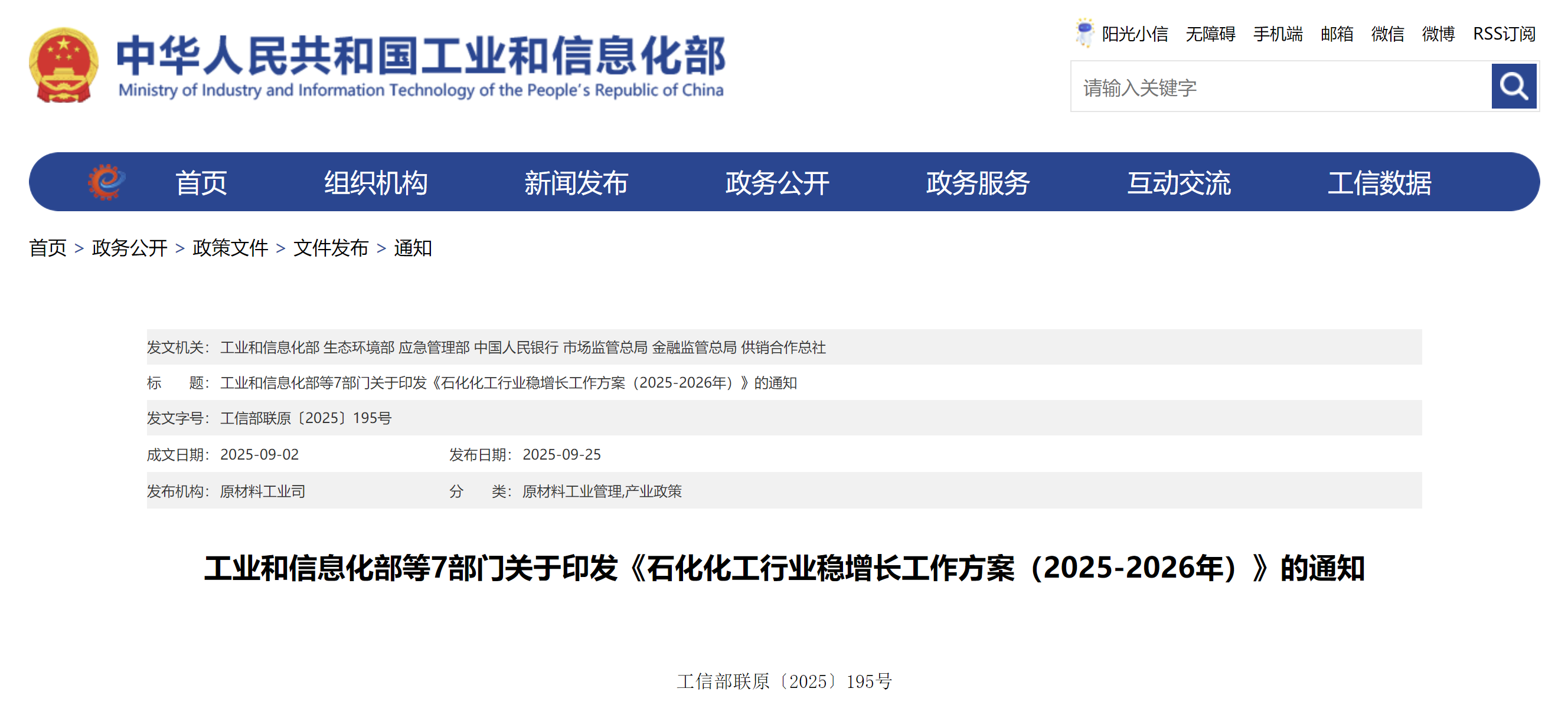 工信部等7部门印发《石化化工行业稳增长工作方案(2025-2026年)》通知