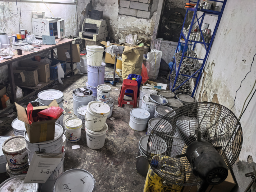 今年7月上旬,东莞市应急管理局清溪分局执法人员就常态化打击“黑危化”工作对清溪镇某工业园进行摸排,发现某工业园6栋一楼铁皮房内有员工形迹可疑。执法人员经过调取周边视频监控,核查系统许可名单,初步锁定该场所涉嫌非法生产危险化学品。7月中旬,执法人员果断出击,在该铁皮房现场发现存放有丙烯酸树脂、白电油、固化剂等化学品(疑似危险化学品)一批,并配备搅拌机等生产设备。执法人员当即责令当事人黄某停止生产,依法查封扣押非法生产的危险化学品并进行抽样送检。经检测,固化剂(闭杯闪点:16摄氏度)、白电油(闭杯闪点:小于0摄氏度)、N00B橡胶油(闭杯闪点:8摄氏度)均属于危险化学品,当事人黄某存在未取得安全生产许可证从事危险化学品生产的行为。