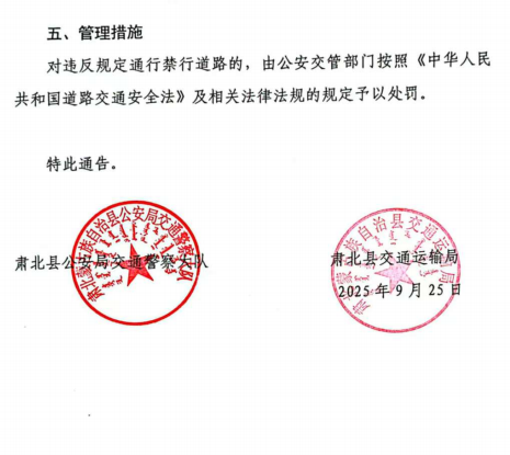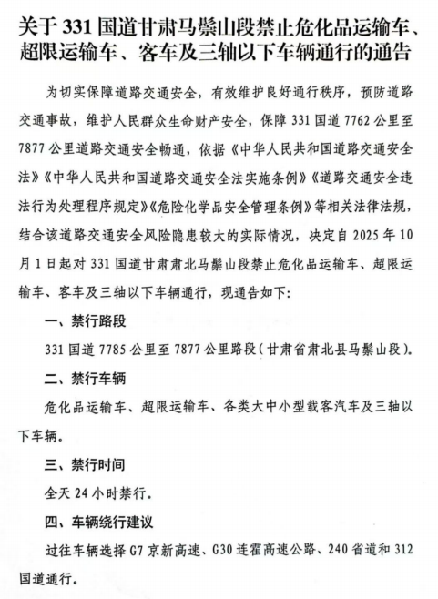 为切实保障道路交通安全,有效维护良好通行秩序,预防道路交通事故,维护人民群众生命财产安全,保障331国道7762公里至7877公里道路交通安全畅通,依据《中华人民共和国道路交通安全法》《中华人民共和国道路交通安全法实施条例》《道路交通安全违法行为处理程序规定》《危险化学品安全管理条例》等相关法律法规,结合该道路交通安全风险隐患较大的实际情况,决定自2025年10月1日起对331国道甘肃肃北马鬃山段禁止危化品运输车、超限运输车、客车及三轴以下车辆通行,现通告如下: