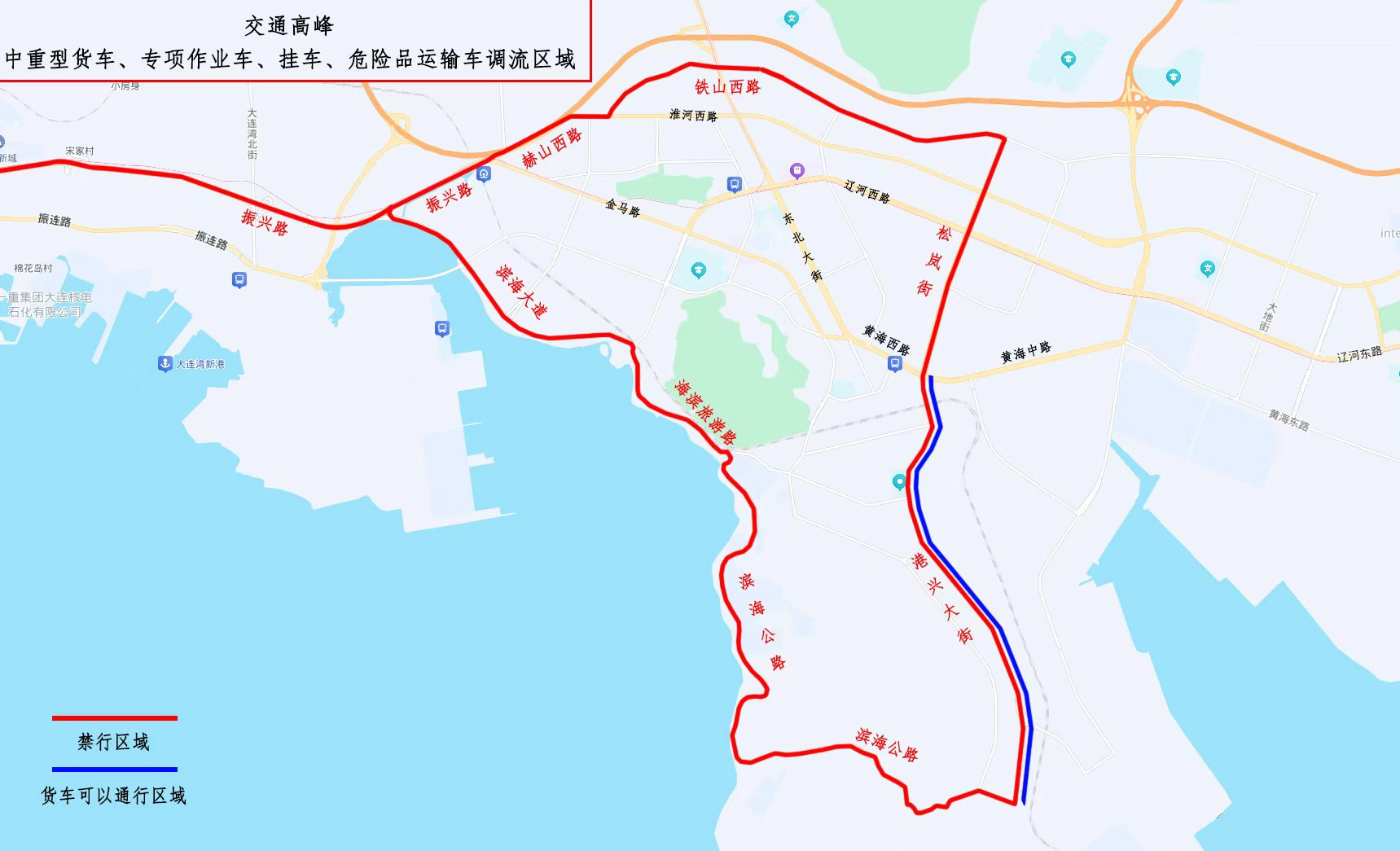 一、每日6时30分至8时30分、16时30分至18时30分,禁止中、重型载货汽车(不含中型厢式货车)、专项作业车以及危险品运输车在金普新区的振兴路、赫山西路、铁山西路、松岚街、港兴大街、滨海公路、海滨旅游路、滨海大道的围合区域及上述除港兴大街以外道路通行。