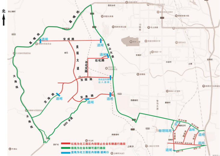 结合企业运行情况,目前对地块中7个路口设置道闸进行封闭。其中,仅允许危化车辆从宝园路道闸(宝山大道与宝园路交叉口)出入化工园区,其余道闸不允许危化车辆出入化工园区。