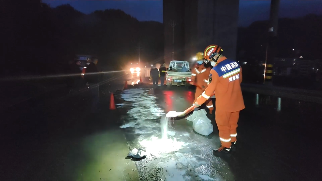 事件:11月4日凌晨,湖南湘西州古丈县默戎镇潭溪村一乡村道路上,一辆运输硫酸的车辆在上坡过程中,大量硫酸从罐体顶部溢出至路面,情况危急。
