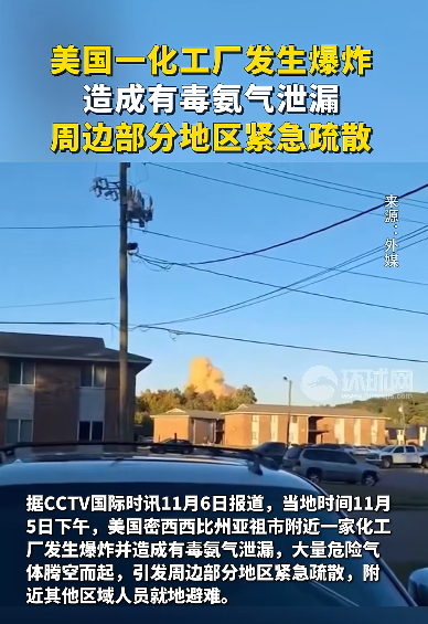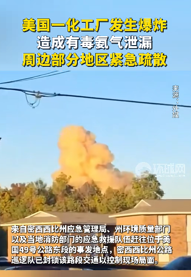 事件:美国当地时间11月5日下午,美国密西西比州亚祖市附近一家化工厂发生爆炸并造成有毒氨气泄漏。