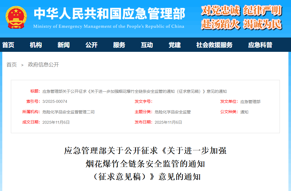 为进一步加强烟花爆竹各环节全链条安全监管,防范重大安全风险,应急管理部研究起草了《关于进一步加强烟花爆竹全链条安全监管的通知(征求意见稿)》及起草说明(见附件1、2)。