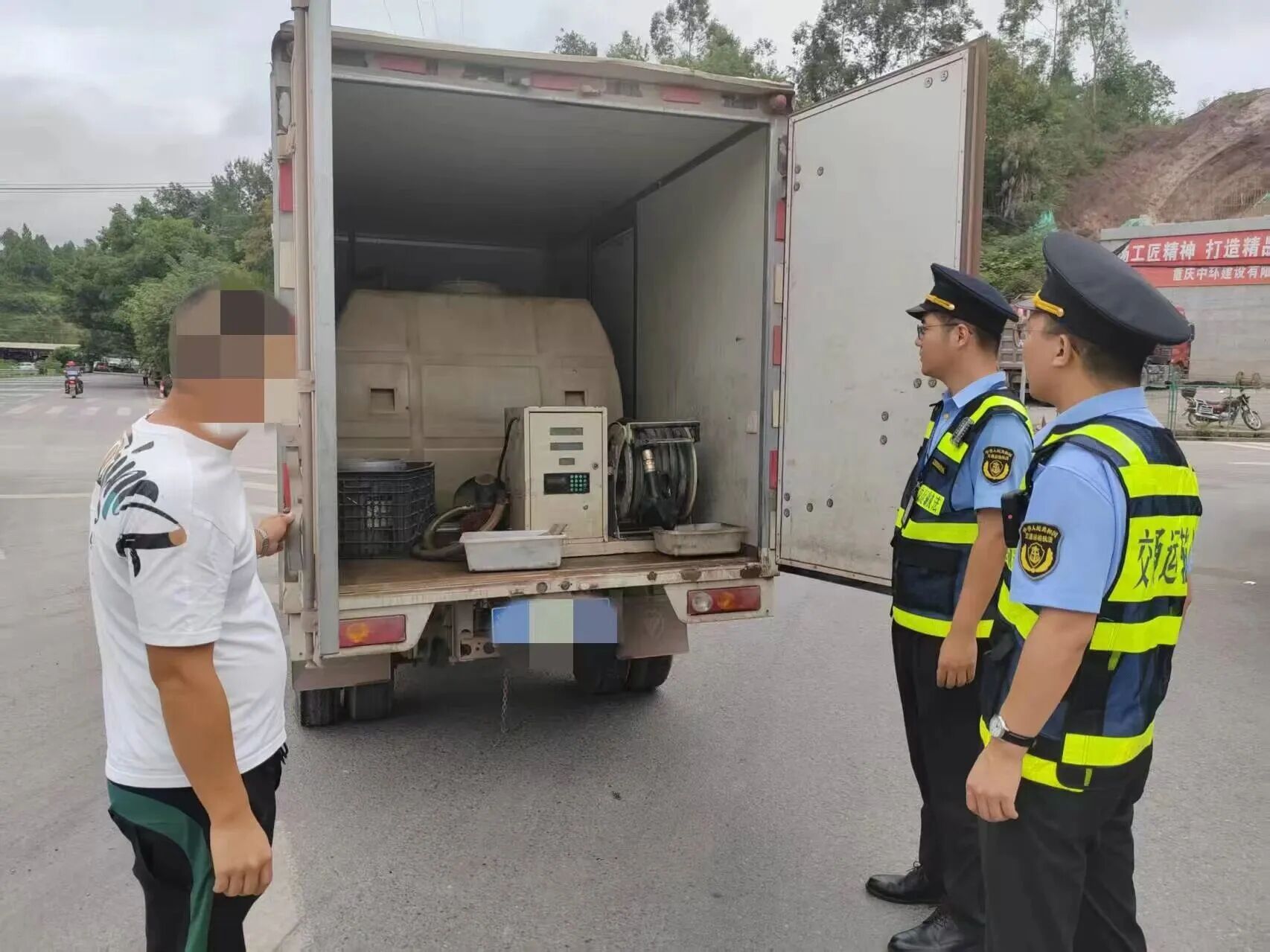 近日,江津区交通执法六、八大队在G212线蔡家路段开展联合执法行动时,检查到一辆未取得道路危险货物运输许可的轻型厢式货车,擅自装载约1000升柴油正在运输。柴油属易燃危险品,非法运输车辆犹如“移动炸弹”,严重威胁道路交通安全。