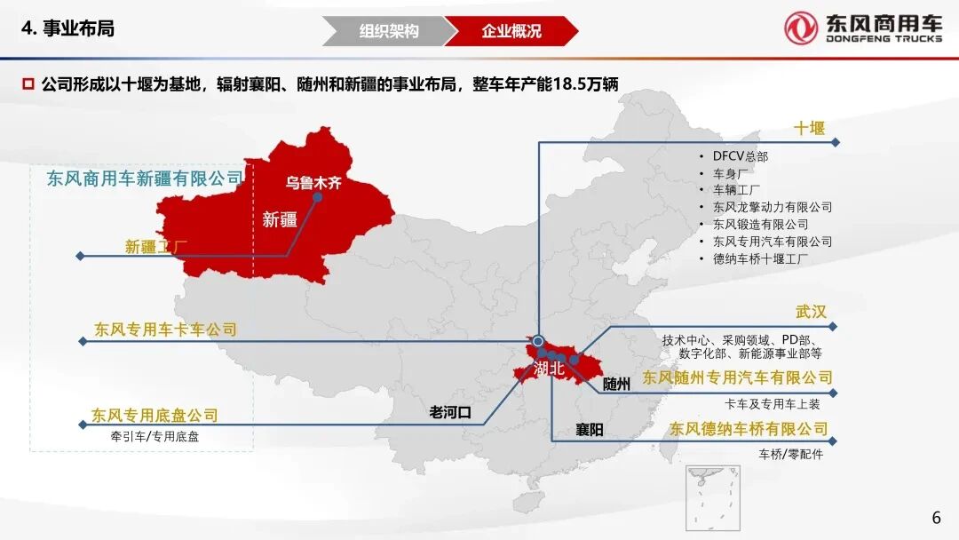 公司拥有独立的研发中心、2个专业厂、8家子(分)公司,形成了以十堰为基地,辐射襄阳、随州和新疆的事业布局,涵盖中重型整车、关键总成(驾驶室、车架、发动机、变速箱、车桥)、铸锻、后市场等主要业务,现有从业人员1.5万余人,整车年生产能力18.5万台,累计销量约550万辆。
