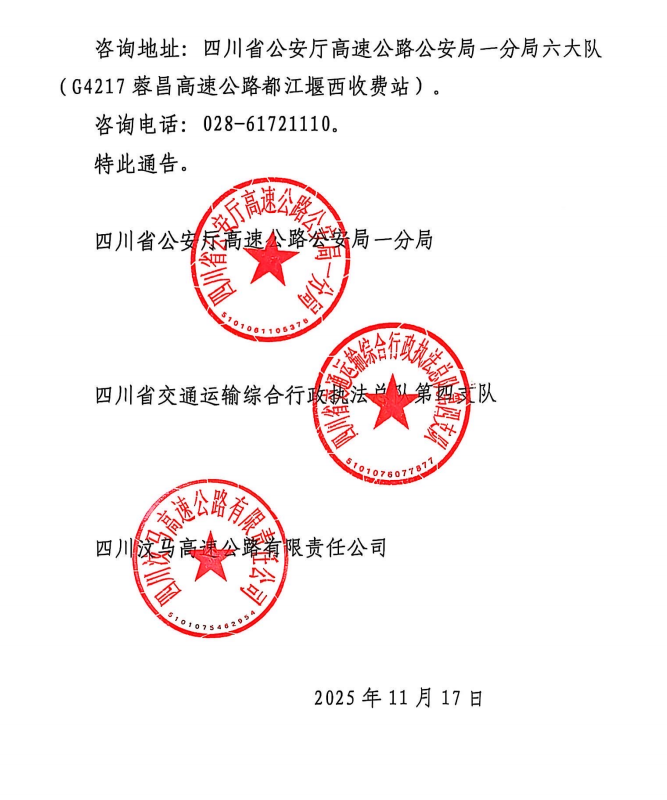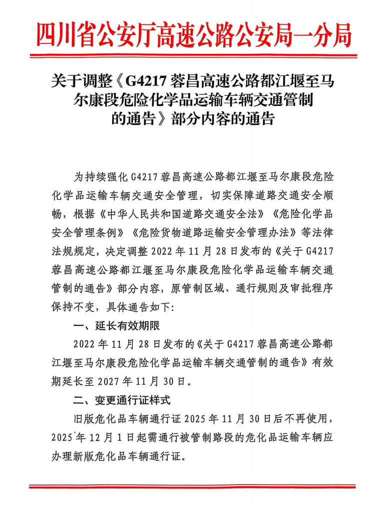 为进一步加强高速公路危险化学品运输车辆交通安全管理,预防和减少道路交通事故,根据《中华人民共和国道路交通安全法》《危险化学品安全管理条例》《危险货物道路运输安全管理办法》《中华人民共和国道路交通安全法实施条例》《四川省<中华人民共和国道路交通安全法>实施办法》《四川省高速公路条例》等相关法律法规的规定,四川省公安厅高速公路公安局一分局、四川省交通运输厅高速公路交通执法第四支队、四川汶马高速公路有限责任公司决定自2022年12月1日起,实施G4217蓉昌高速公路都江堰至马尔康段限制危险化学品运输车辆(含空车)通行交通管制措施。现通告如下: