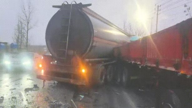事件:12月12日凌晨5时许,湖北孝感G107国道蔡上湾附近发生一辆油罐车在路口等候红灯时,被后方半挂车猛烈追尾,罐体破裂导致汽油持续泄漏。