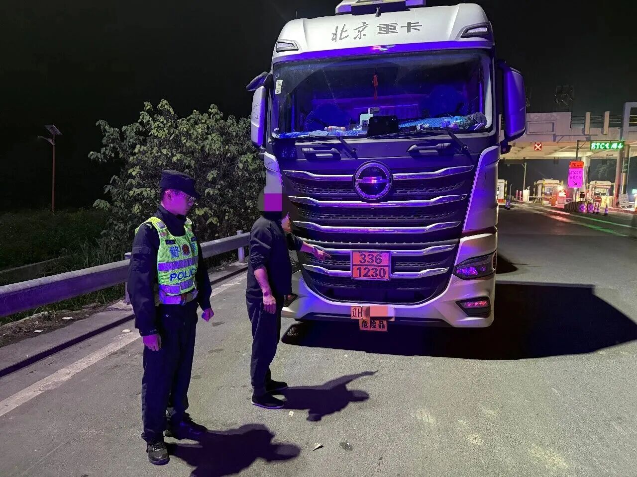 2025年12月30日0时许,百色交警高速三大队执勤组巡逻至G80广昆高速田东县林逢路段时,发现一辆辽H号牌的危险品运输车违反禁令在高速公路上行驶,立即通过喊话器引导该车就近驶出高速公路下思林收费站接受进一步处理。