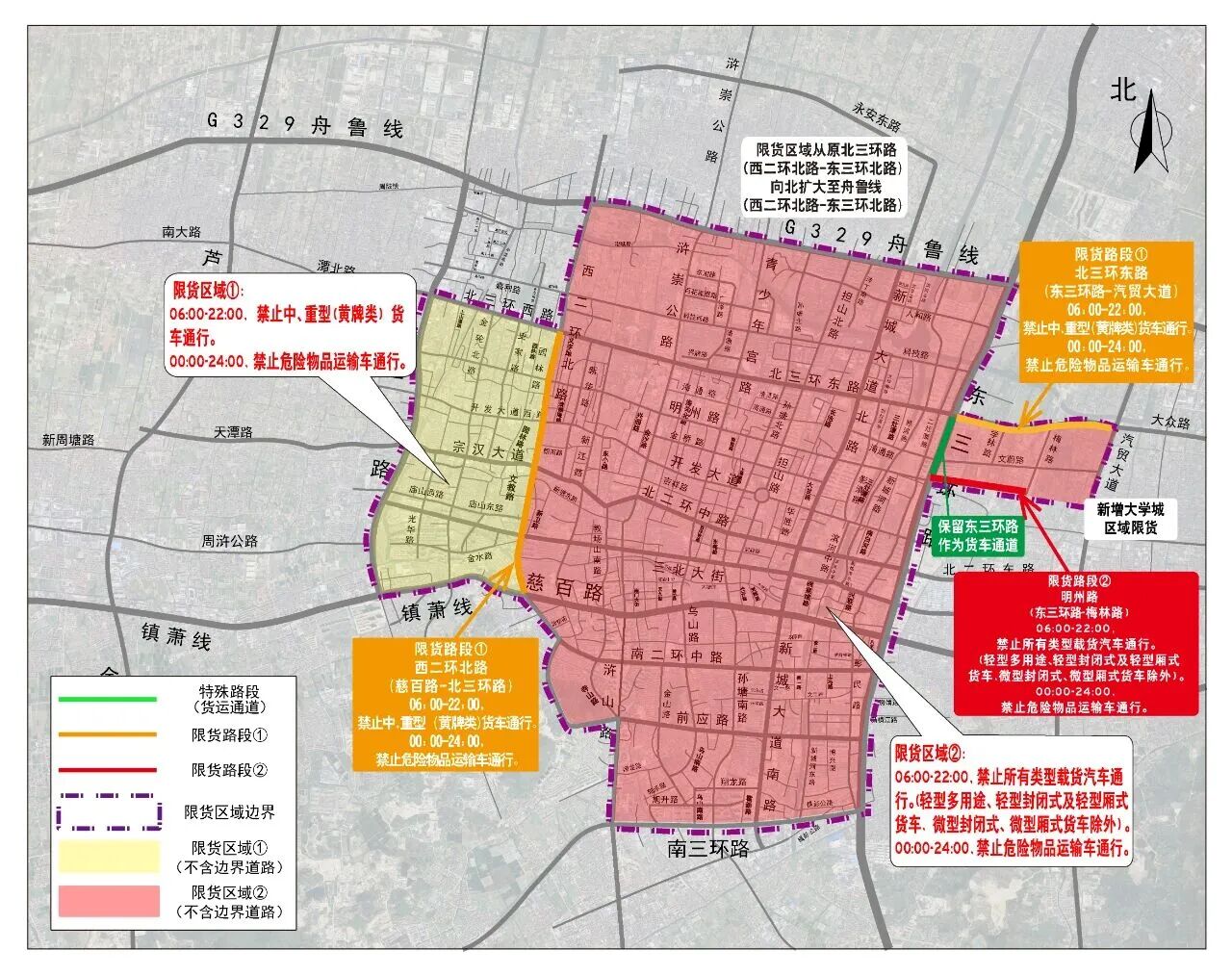 (二)“限货”区域②(图中红色区域):西二环北路—G329舟鲁线—东三环北路—北三环东路—汽贸大道—明州路—东三环北(南)路—南三环路—杨梅大道北路—前应 路—西二环南路所形成的区域(不含边界道路)。