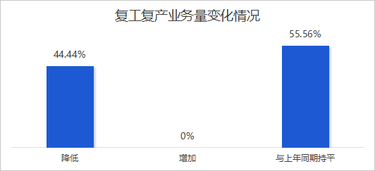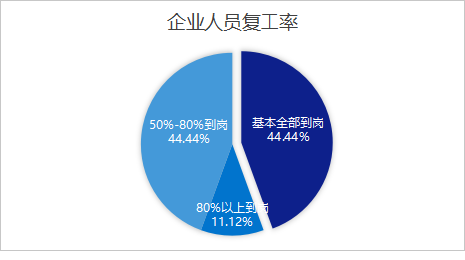 从人员复工情况看,44.44% 的企业实现人员基本全部到岗,11.12% 的企业复工率达到 80% 以上,44.44% 的企业复工率处于 50%-80% 区间,整体复工率处于较高水平。