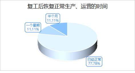 在复工后恢复正常生产运营的时间方面,77.78% 的企业已恢复正常运营,11.11% 的企业预计需一个星期恢复,11.11% 的企业预计需半个月恢复,多数企业复工后运营状态良好。