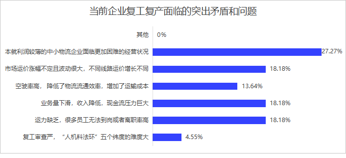 经调研,当前化工运输企业在复工复产过程中也面临突出矛盾与问题。其中,本就利润较薄的中小物流企业经营更加困难诉求最为集中,占比 27.27%;运力缺乏、员工无法到岗或离职率高,业务量下滑、收入降低、现金流压力巨大,以及市场运价波动较大、不同线路涨幅不均三项问题并列第二,各占比 18.18%;此外还存在复工审查严格、空驶率高导致运营成本上升、流通效率偏低等问题,企业整体经营压力显著。