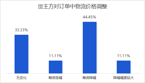 物流价格调整方面,货主方对订单物流价格以下调为主,44.45% 为略微降幅,33.33% 价格无变化,降幅较大与略微涨幅均占 11.11%。