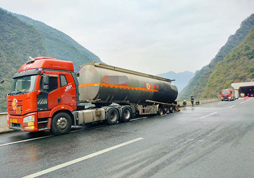 事件:3月4日8时许,在重庆酉阳自治县龚滩镇S3渝湘复线高速彭酉路段上行出城方向K208+212处,一辆满载甲醇罐车突发轮胎起火(豫CRXXXX ,核载34吨,实载33.6吨)。