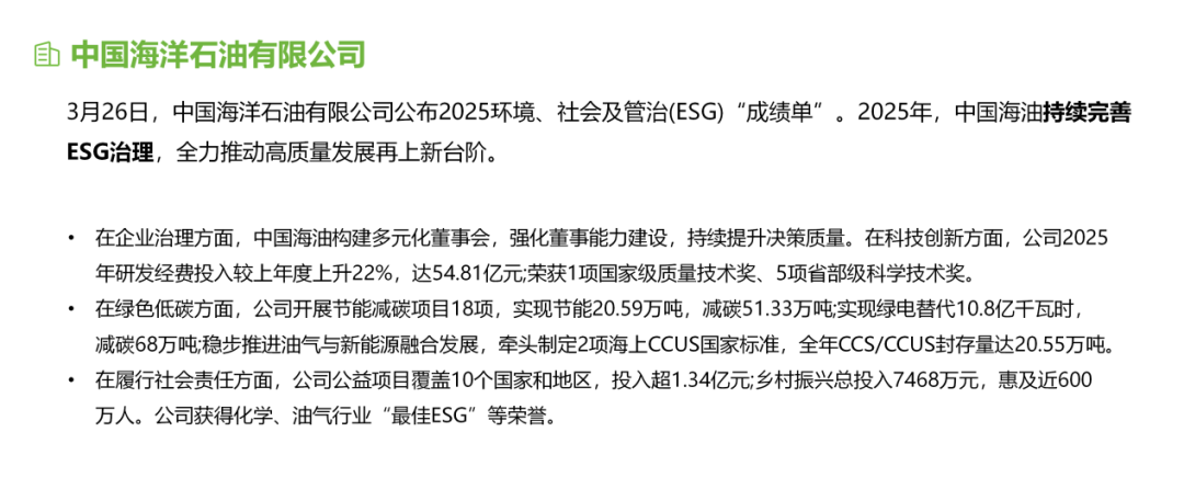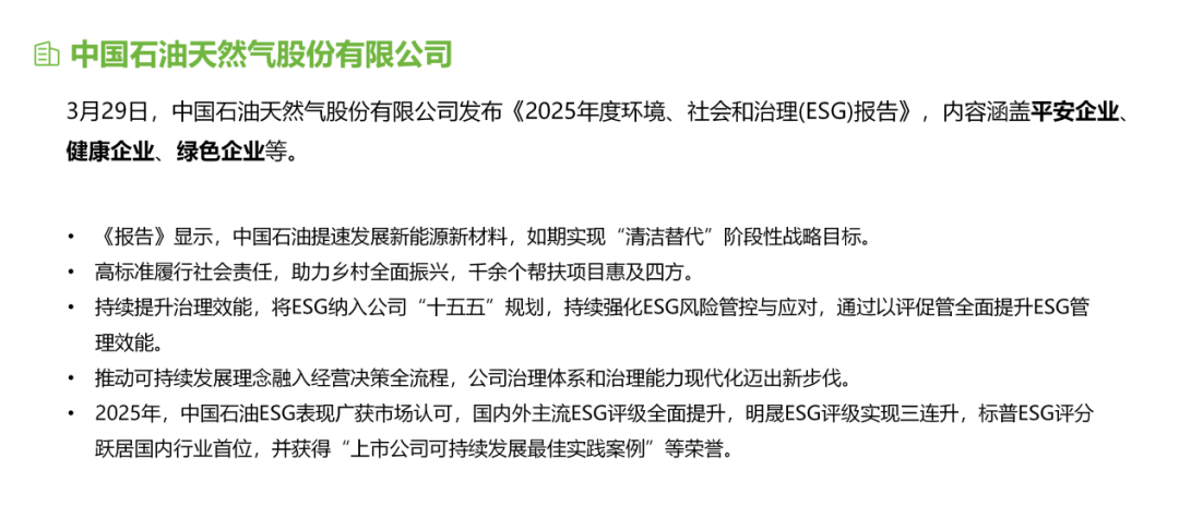 中国石油、中国海油、中国化学陆续发布《2025年度环境、社会和治理(ESG)报告》,全面展示过去一年在转型步伐全面加快背景下,石化央企在ESG治理、绿色低碳、社会责任等方面的最新实践与取得的突出成效。