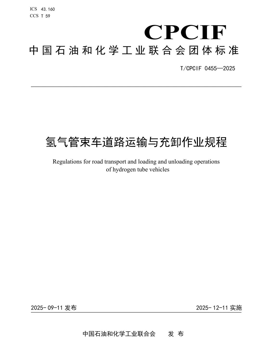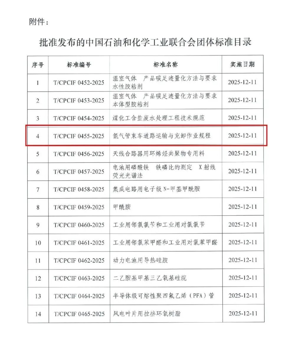 为提升氢气运输服务领域规范,提升氢气储运环节规范化管理水平,通过从从技术标准层面针对氢气管束车运输制定运输管理的规范要求,从而促进氢气管束车运输市场的规范、有序发展。由中国石油和化学工业联合会提出,中国石油和化学工业联合会标准化工作委员会归口的团体标准《氢气管束车道路运输与充卸作业规程》(T/CPCIF 0455—2025)于2025年9月11日正式发布,2025年12月11日正式实施。