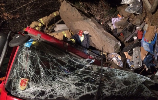 记者在现场看到,罐车侧翻到了山体一侧,强烈的撞击使车头严重变形。消防人员介绍,这起事故发生在下午3点20分左右,车内驾驶员已经身亡,副驾驶被严重变型的车体牢牢卡住,身体的大部分都被裹在了铁皮中,一块重达两吨多的山石砸进了驾驶室内,加之作业空间有限,救援难度很大。