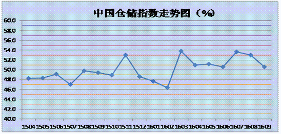 中国物流与采购联合会与中储发展股份有限公司联合调查的2016年9月中国仓储指数为50.6%,较上月回落2.4个百分点,连续七个月位于扩张区间。各分项指数中,期末库存指数、设施利用率指数、新订单指数及业务活动预期指数较上月有所回落,延伸业务量指数、收费价格指数及企业员工指数与上月持平,其余指数均有不同程度的回升。