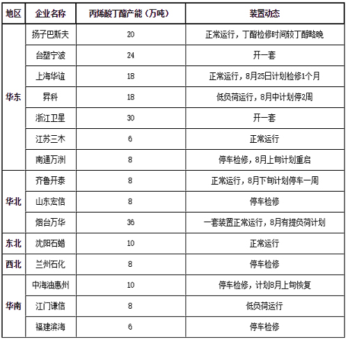 正丁醇最大下游丙烯酸丁酯,前期成本压力下,部分装置表示有停车或降负意向,那么,随着7月底至今丙丁酯价格的拉涨,丙丁工厂摆脱亏损状况,目前丙丁酯装置的变化情况呢?从下面的表格中,可以预计8月丙丁酯产量较7月份略有减少。醋酸丁酯装置方面,江阴百川暂未重启,7月底开始,兖矿醋酸丁酯装置开始停车,其正丁醇外销量大幅增加,预计8月醋酸丁酯的产量也将略有减少。另一下游DBP由于华北地区环保检查并未有放松迹象,河北地区整体开工率偏低。整体而言,8月正丁醇下游需求方面目前来看有减弱预期。