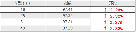 车型指数分别为18吨分别是97.41点,25吨97.32点,31吨97.21点、49吨分别是97.29点。