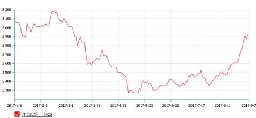 8月底市场重心直线上升,其中江苏主港价格自2620元/吨最高飙涨至2940元/吨,西北厂家出厂价自2020元/吨飙至2430元/吨附近,各地市场周涨幅均在400元/吨左右,涨势令人咋舌。