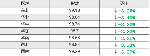 其中,区域指数分别为东北99.18点,华北98.04点,华中98.74点,华东98.7点,华南98.68点,西北98.83点,西南99.29点。