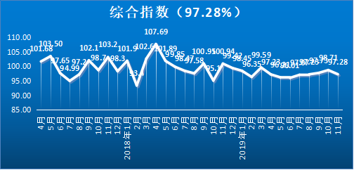 由中国物流与采购联合会危化品物流分会联合摩贝(上海)生物科技有限公司发布的危险货物道路运输价格指数2019年11月为97.28点,环比下降了1.45%。