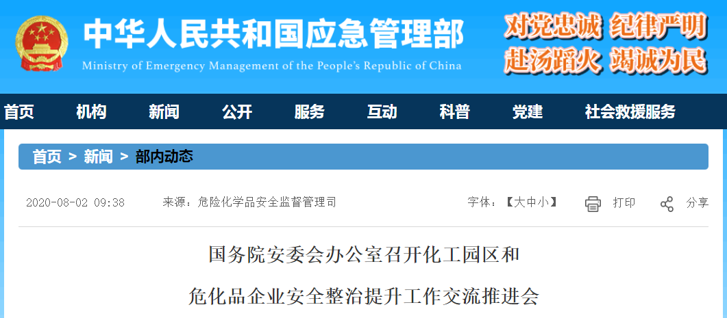 7月31日,国务院安委会办公室召开化工园区和危化品企业安全整治提升工作交流推进会,落实全国安全生产电视电话会议部署,加快推进落实关于全面加强危化品安全生产工作的意见和危化品安全生产专项整治三年行动计划,交流并部署化工园区和危险化学品企业安全整治提升及非法违法“小化工”专项整治工作。应急管理部副部长刘伟出席会议并讲话。