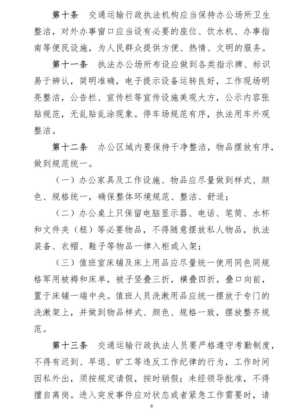 (六)严肃执法风纪。组织实施《交通运输行政执法风纪规范》(附件3),全面规范执法人员着装、仪容举止、用语和内务,抵制“慵、懒、散”等不良工作作风,杜绝风纪不严整、语言不文明、出勤不出力、在岗不在状态等突出问题。建立完善勤务巡查、值班值守、应急响应等工作机制,加大监督检查力度,主动接受人民群众监督,树立交通运输执法队伍新风貌。