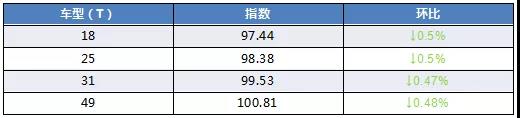 车型指数分别为18吨97.44点,25吨98.38点,31吨99.53点、49吨100.81点。