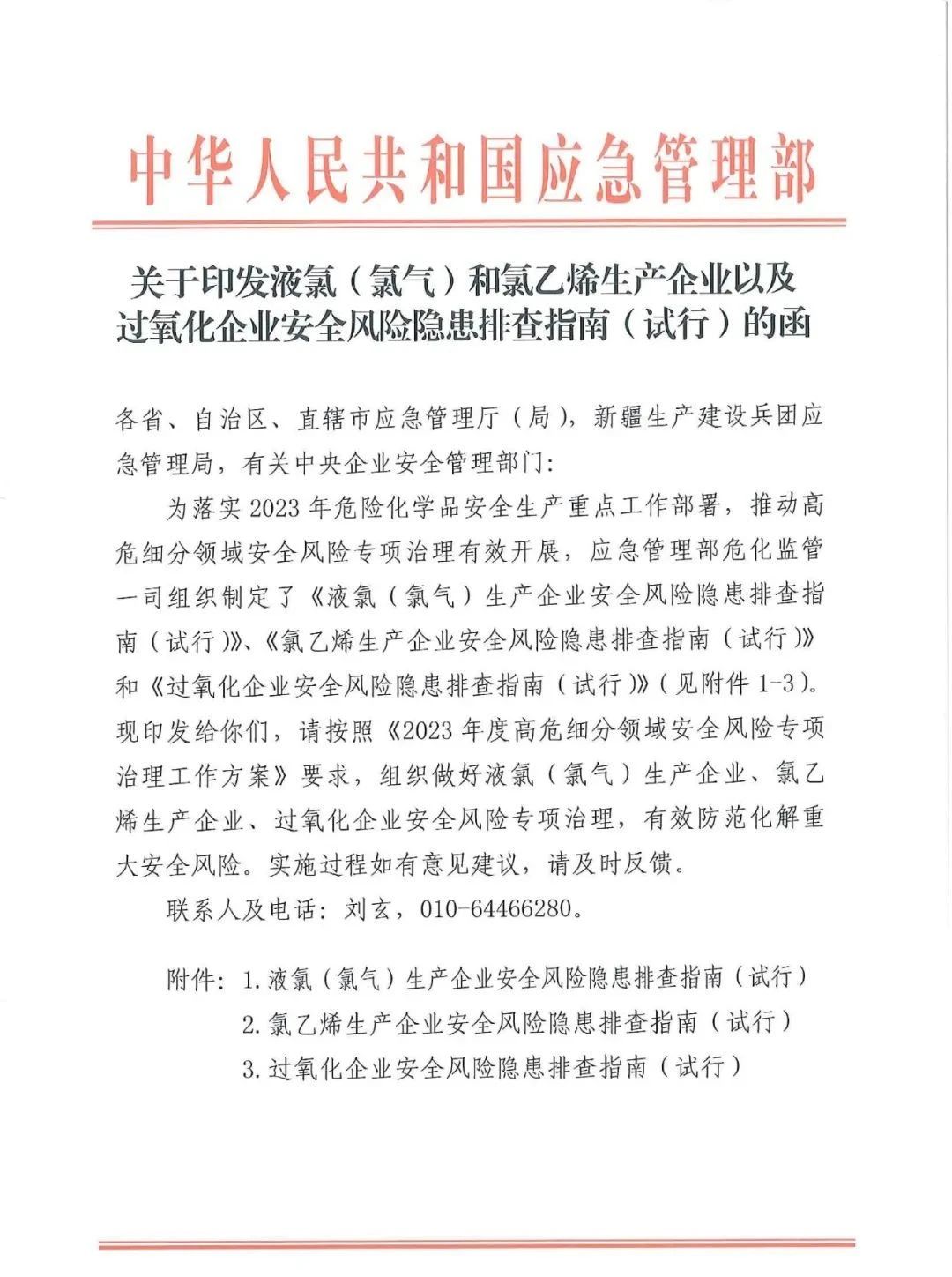 应急部印发液氯(氯气)、氯乙烯、过氧化企业安全风险隐患排查指南(试行)的函