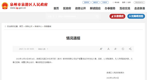 目前,据泉港区人民政府新闻办通知,泉港石化园区中化学天辰(泉州)新材料有限公司生产装置试运行时发生火情。事故造成1人受轻微伤,无人员受困或失联,火情已控制,装置已停止运行,事故原因正在调查中。