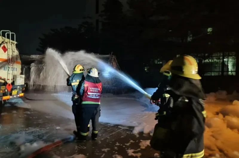 事件:8月12日23时45分,中山市民众街道沿江村沿江路一辆槽罐车侧翻泄漏。
