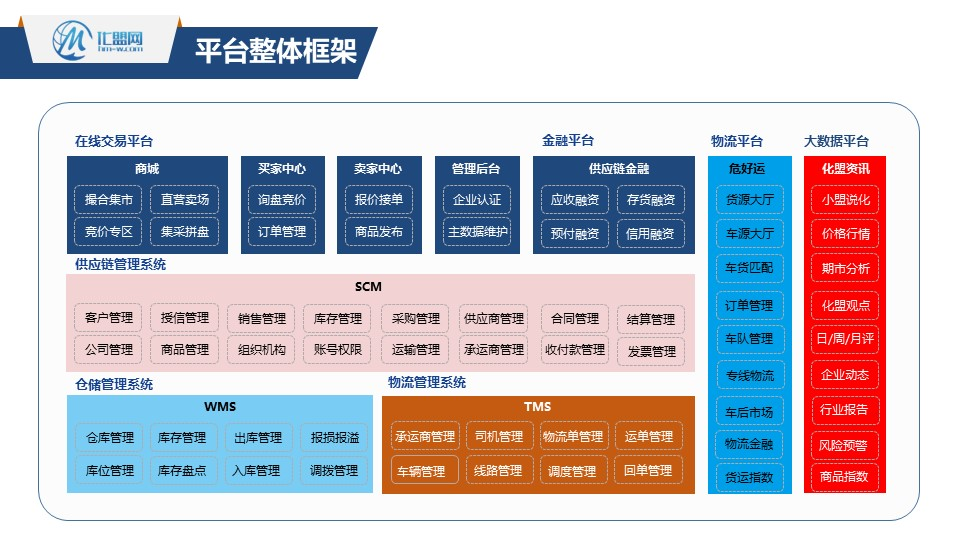 化盟网是永诚恒易投资运营的化工行业垂直B2B平台,于2019年6月17日上线运营,化盟网以化工大宗原材料为主要切入点,建设了面向化工行业的“在线交易+云物流+化工行业大数据+供应链金融”四大服务平台和 “数字化采销系统、供应商管理系统、运输管理系统”三大支撑系统。