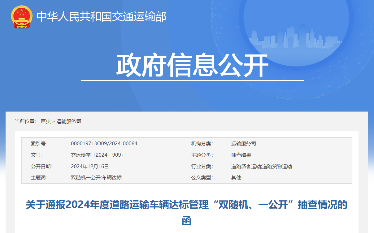 为加强道路运输车辆技术管理,保障车辆本质安全和节能水平,根据《交通运输部关于深化“双随机、一公开”监管工作的实施意见》(交法发〔2019〕85号)《交通运输部办公厅关于进一步提升道路运输车辆检验检测服务水平的通知》(交办运函〔2024〕1576号)有关要求,我司组织对福建、广东、广西、四川、贵州、甘肃、宁夏等7省(自治区)的14个市、区(县)级交通运输主管部门、28家受委托承担道路运输车辆实车核查工作的机动车检验检测机构(以下简称实车核查机构),以及4家道路运输车辆达标车型检测机构(以下简称达标车型检测机构)开展了“双随机、一公开”抽查工作。现将有关情况通报如下: