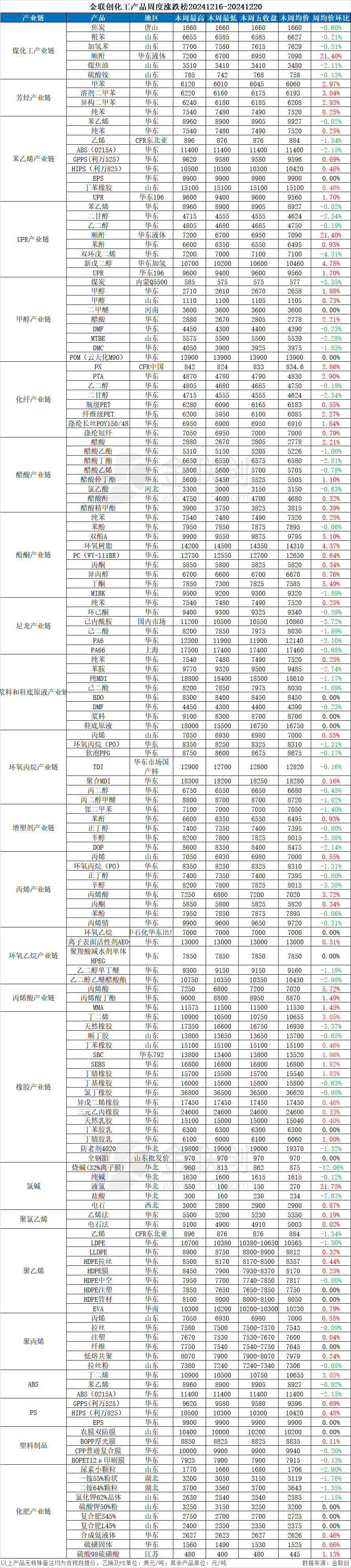 据某机构监测的132种化工品,上周期(12.16-12.20),57个品种上涨,17个品种持稳,58个品种下跌,上涨率43.18%;下跌率43.94%。57个上涨品种中,涨幅最大5个品种分别是液氯(31.75%)、顺酐(21.40%)、 丙烯酸(5.72%)、丁酮(5.49%)、双酚A(5.10%);58个下跌的品种中,跌幅最大5个品种,分别是烧碱(32%离子膜)(-12.06%)、盐酸(-7.87%)、双环戊二烯(-4.31%)、己内酰胺(-3.72%)、辛醇(-3.38%)。