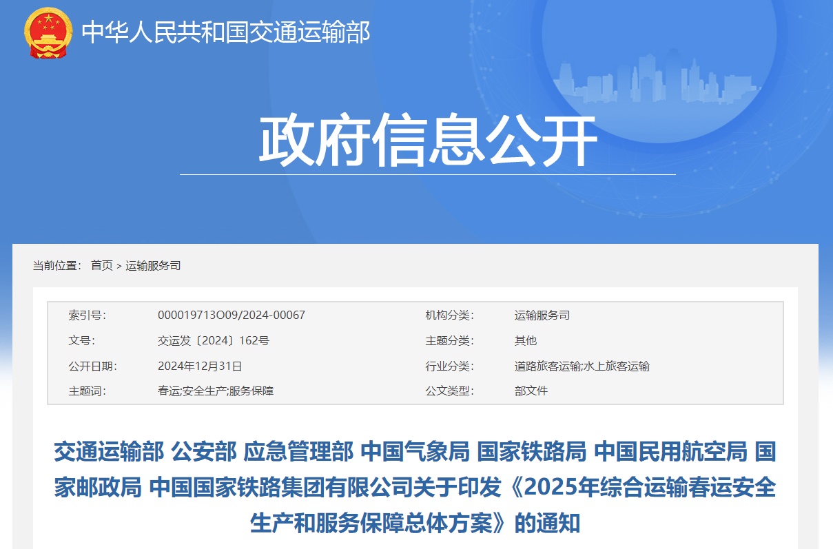 2025年综合运输春运自1月14日开始,2月22日结束,共40天。为深入贯彻落实党中央、国务院决策部署,切实做好2025年综合运输春运安全生产和服务保障工作,制定本方案。