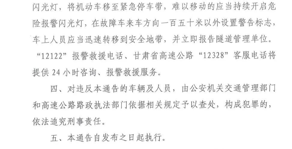 三、车辆在隧道内发生故障,驾驶人应当立即开启危险报警闪光灯,将机动车移至紧急停车带,难以移动的应当持续开启危险报警闪光灯,在故障车来车方向一百五十米以外设置警告标志,车上人员应当迅速转移到安全地带,并立即报告隧道管理单位。“12122”报警救援电话、甘肃省高速公路“12328”客服电话将提供24小时咨询、报警救援服务。