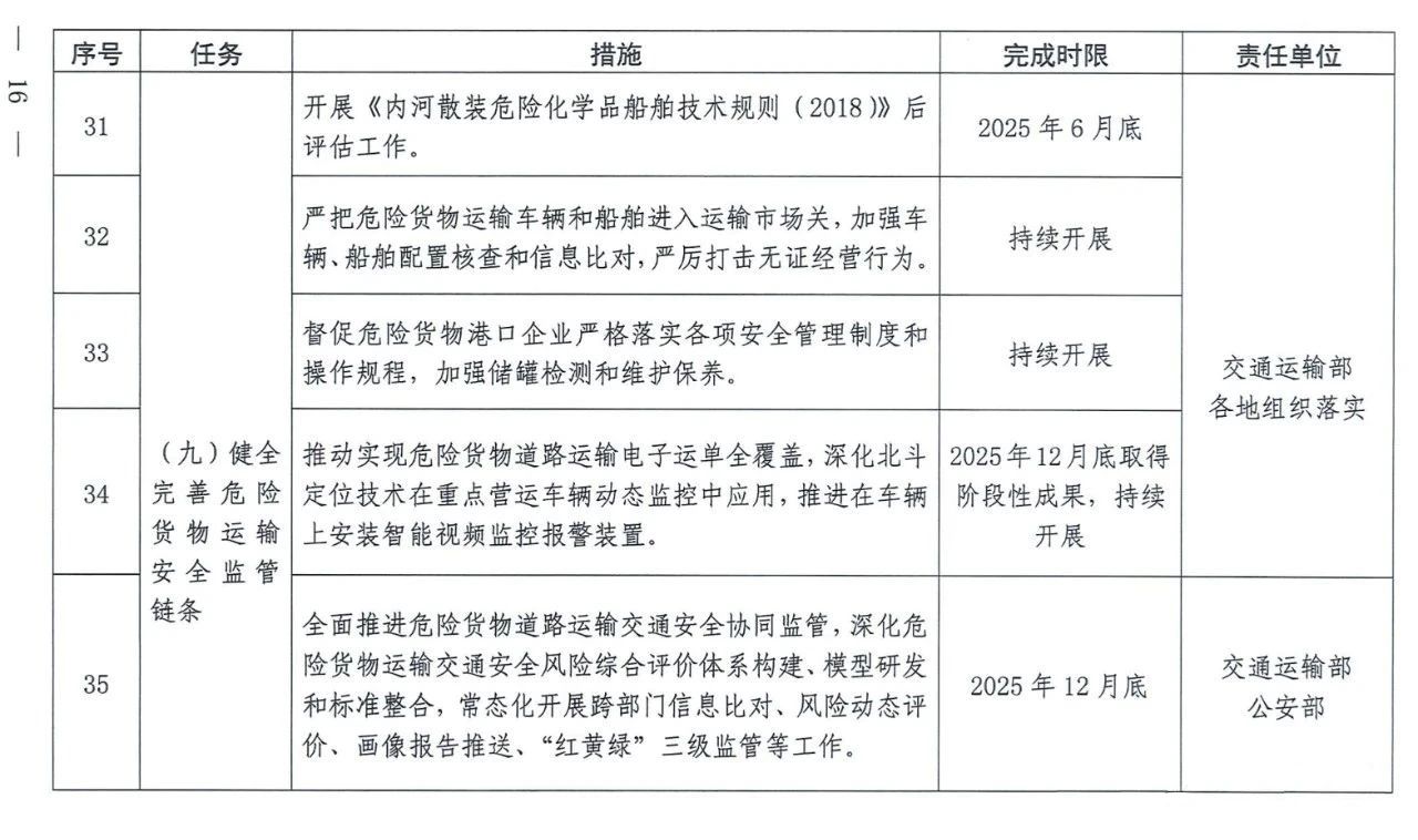 6.运输环节管控:2025年底前实现危险货物道路运输电子运单全覆盖,推广北斗定位和智能视频监控;严查危险货物谎报瞒报、非法改装,建立跨部门“红黄绿”三级监管机制。