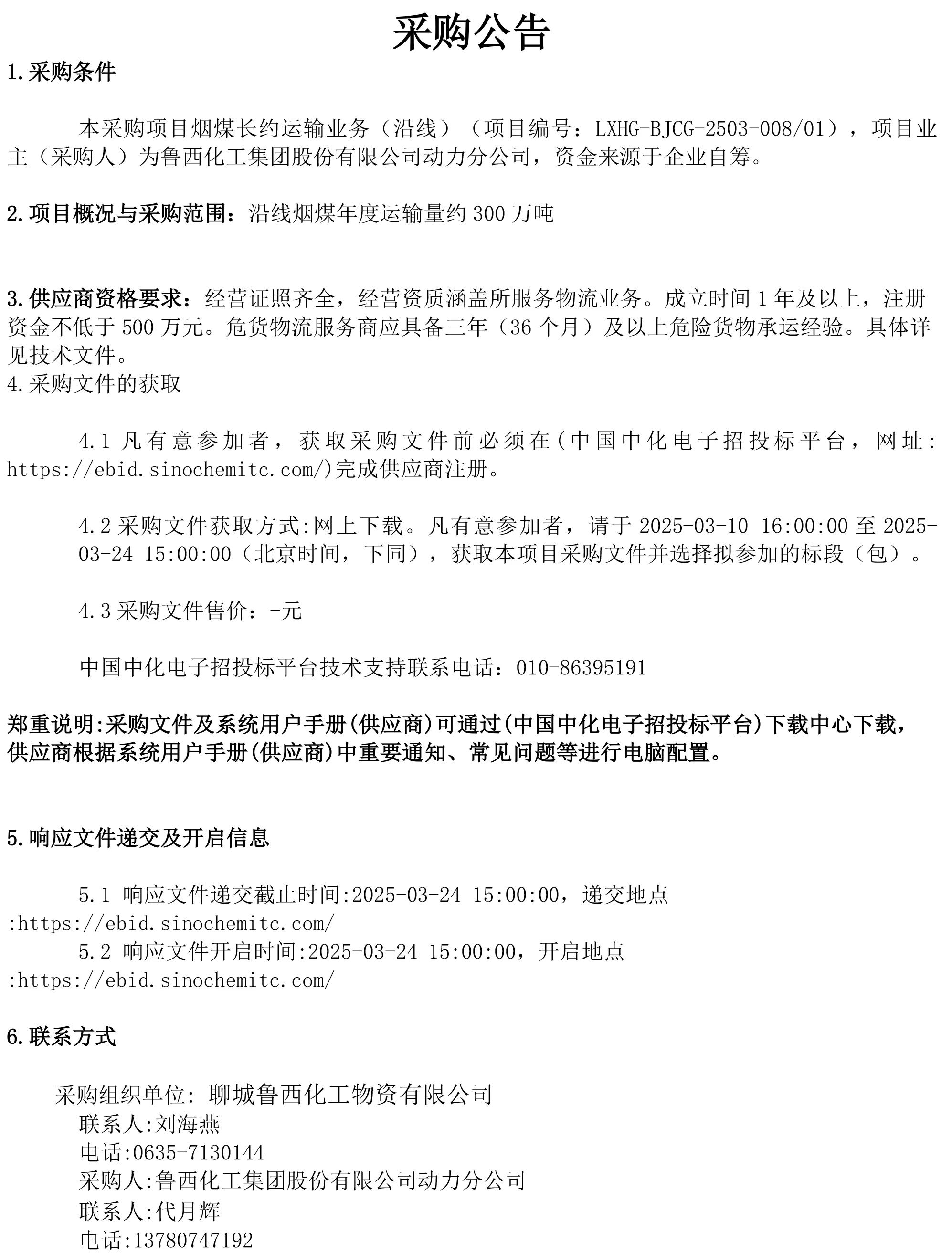 本采购项目烟煤长约运输业务(沿线)(项目编号:LXHG-BJCG-2503-008/01),项目业主(采购人)为鲁西化工集团股份有限公司动力分公司,资金来源于企业自筹。