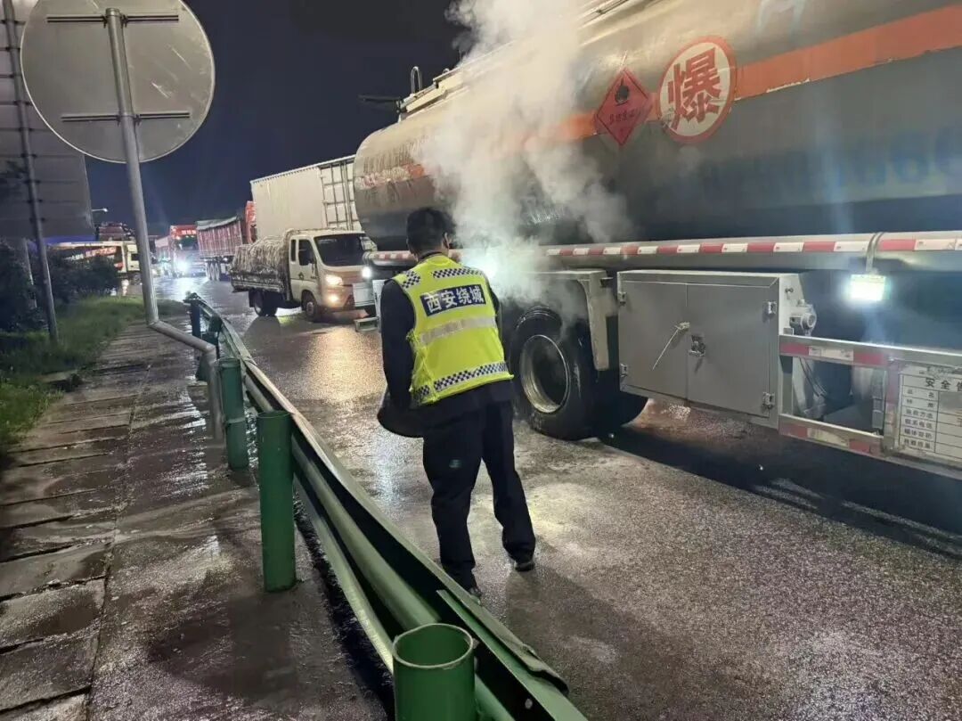 事件:10月12日晚20时,西安绕城分公司未央北收费站入口车流平稳有序,一辆陕B牌照的重型油罐车驶入车道时,后方轮胎猛地窜出黑烟,随即燃起明火。