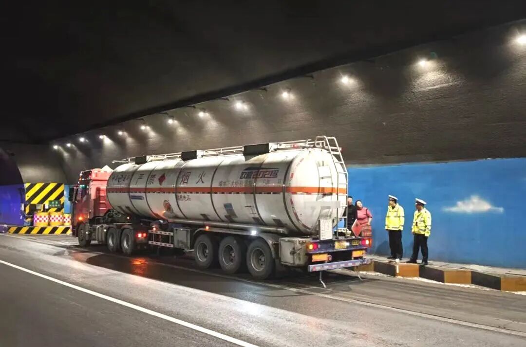 事件:10月9日,山西高速民警巡逻至太临高速架梁山隧道(太原方向)时,发现一辆危化品运输车辆停于隧道内,民警迅速设置安全区域,引导后方车辆减速避让。