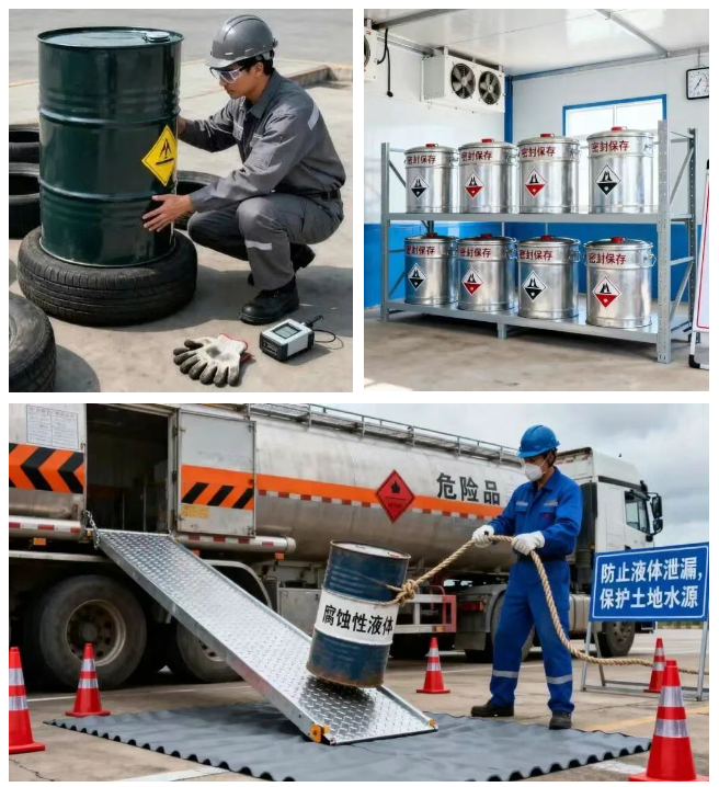 4、装货前,罐车接好有效静电接地线,装货高度必须符合规定要求,不得超装,高温季节要留有一定的安全空容量,以防在运送过程中溢出货物;