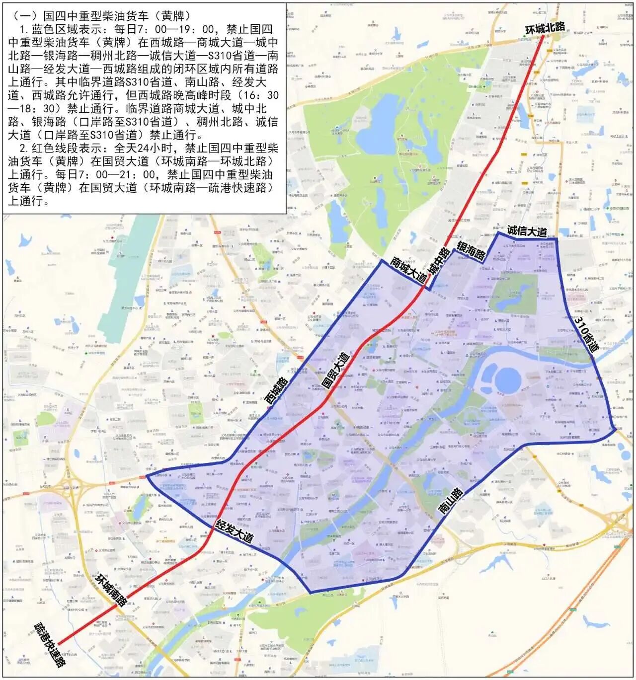 2、全天24小时,禁止国四中重型柴油货车(黄牌)在国贸大道(环城南路—环城北路)上通行。每日7:00—21:00,禁止国四中重型柴油货车(黄牌)在国贸大道(环城南路—疏港快速路)上通行。