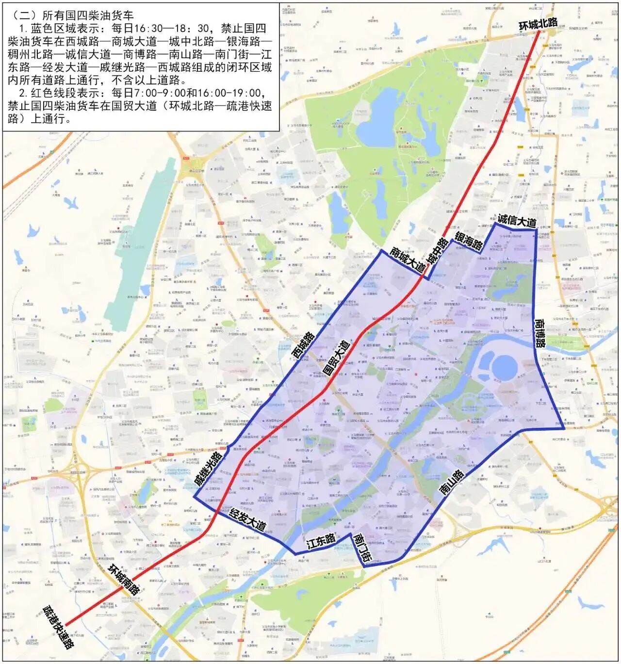 2、每日7:00-9:00和16:00-19:00,禁止国四柴油货车在国贸大道(环城北路—疏港快速路)上通行。