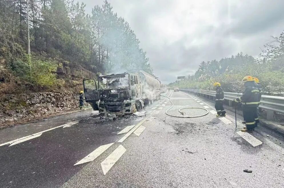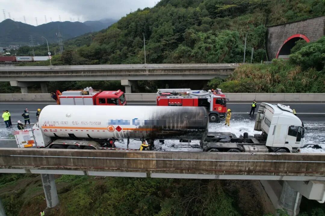 事件:11月9日中午,宁波市北仑区穿山疏港高速一辆载有20.7吨液化天然气的罐车车头突然起火,现场浓烟滚滚。