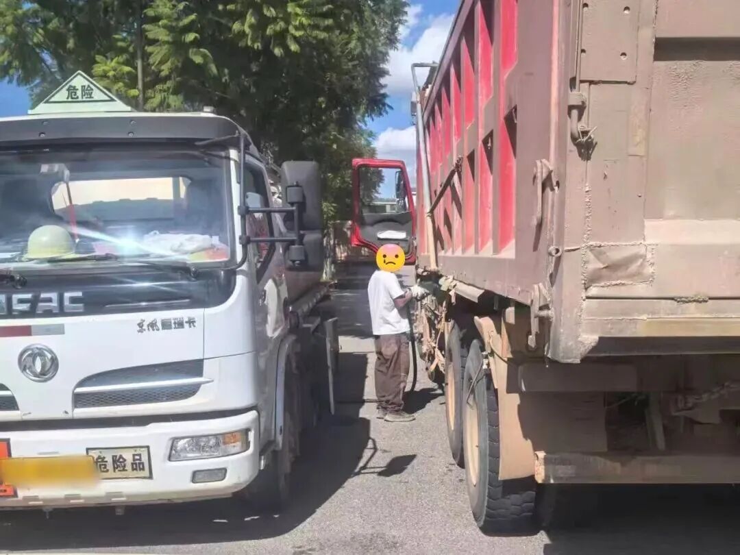 2025年11月12日14时17分,昆明交管六大队民辅警巡逻至文兴路与新丰路交叉口时发现,一辆白色油罐车与一辆大货车并排违规停靠在非机动车道内,一名男子正手持加油枪为旁边大货车的进行加油作业存在极大安全风险。